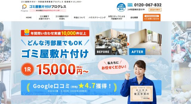 業界最安値に挑戦しており、各種クレジットカード払いやQRコード決済の相談もできる。年中無休なのでいつでもゴミ屋敷の片付けを相談できる。 |