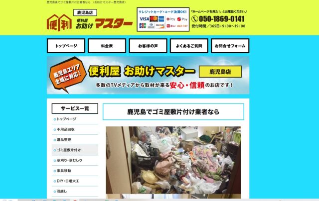 鹿児島県をはじめ、全国の優良ゴミ屋敷を紹介してくれる。24時間いつでも相談ができること、支払いの選択肢が多く希望を伝えられる。希望通りの片付けに対応。